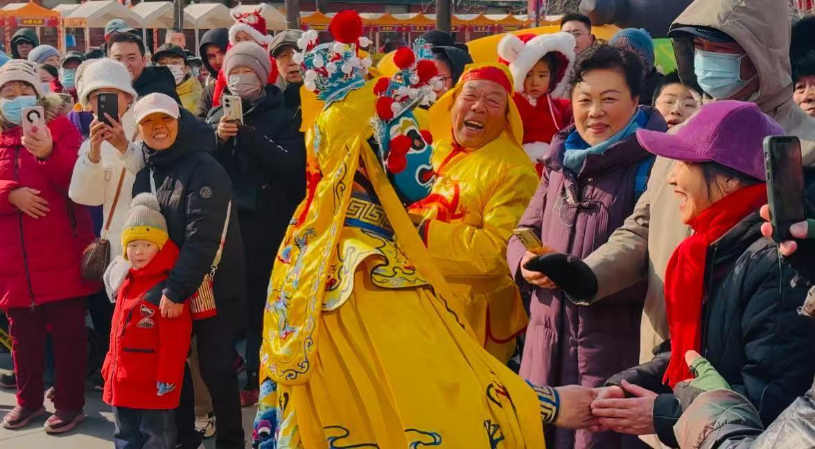 在年俗演出現(xiàn)場,只見“變臉大師”頭戴花冠穿錦衣,轉(zhuǎn)身揮袖間,多臉齊變令人直呼過癮;獅舞慶新年,金鼓聲聲喧。舞獅作為一種中國民間傳統(tǒng)的表演藝術(shù),寓意事事如意。只見表演者裝扮成獅子模樣,在鑼鼓音樂的伴奏下,身輕如燕做出獅子的各種形態(tài)動作,以龍騰虎躍神獸舞為春節(jié)助慶;一曲《紅梅贊》搭配京劇的曲調(diào),字正腔圓地以紅梅傲雪的精神,將“一片丹心向陽開”的熱情傳達給每一位觀眾;河北梆子《大登殿·金牌調(diào)來銀牌宣》的表演者嗓音明亮,氣勢十足,唱得又穩(wěn)又好,贏得了觀眾們的陣陣掌聲和聲聲喝彩。另有滑稽劇演繹百態(tài)人生,《烏蘇里船歌》《草原夜色美》《呼倫貝爾大草原》旋律優(yōu)美的獨唱,豫劇《朝陽溝·祖國的大建設(shè)一日千里》《花木蘭·誰說女子不如男》、京劇《紅燈記·光輝照兒永向前》、評劇《花為媒·李月娥遮衫袖》等耳熟能詳?shù)慕?jīng)典傳統(tǒng)戲曲段子依次上演,在熱鬧與喧囂的喜慶氛圍中,傳達著新年的祝福與吉祥。